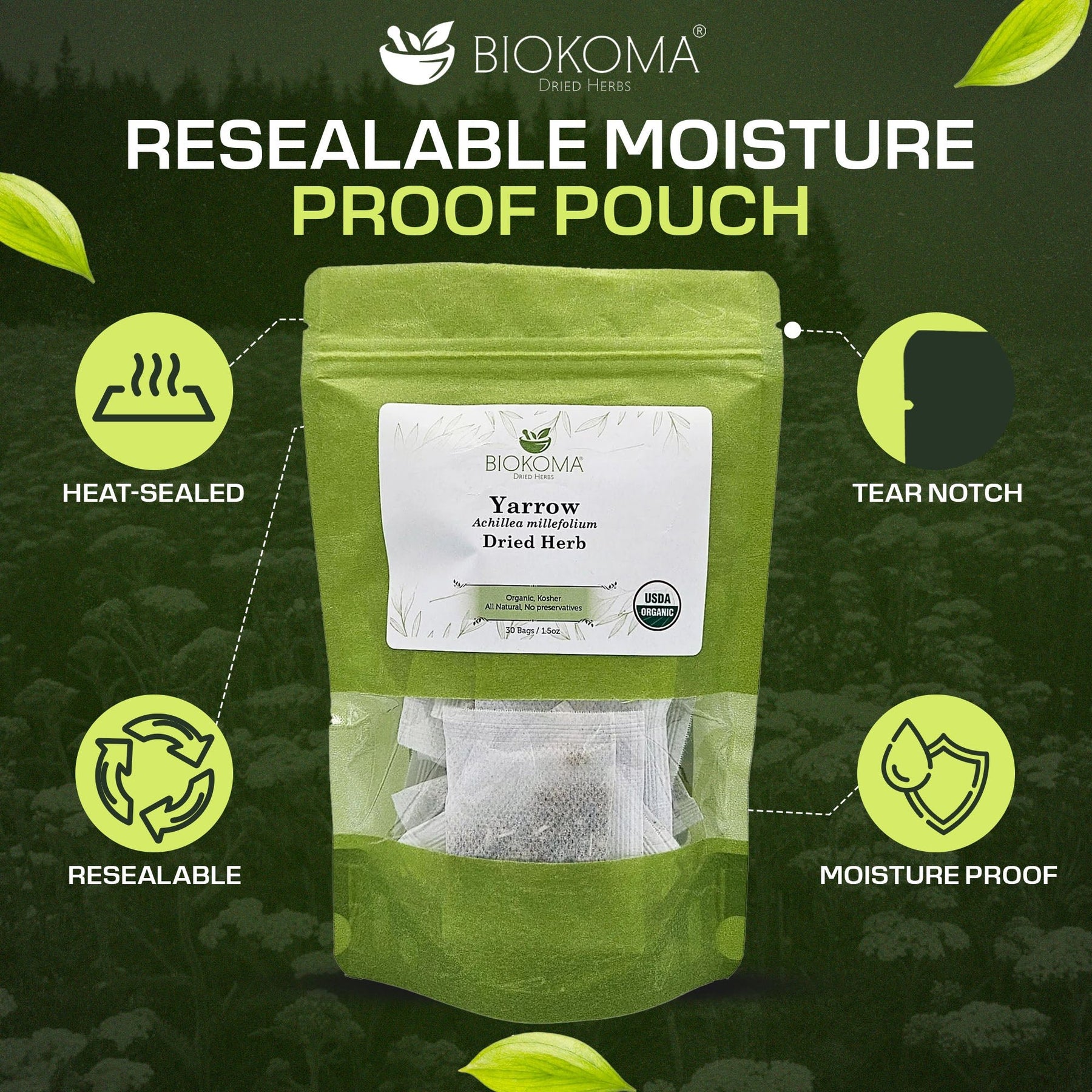 Yarrow (Achillea millefolium) Organic Dried Herb 30 Tea Bags 1.5oz